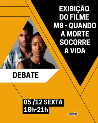Dia 05/11, sexta-feira, às 18h, exibiremos o filme M8: Quando a Morte Socorre a Vida, dirigido por Jeferson De. Na sequência, às 19h30, debateremos com a diretoria de Comunidade e Cultura, sob a coordenação de Eloá Bittencourt.